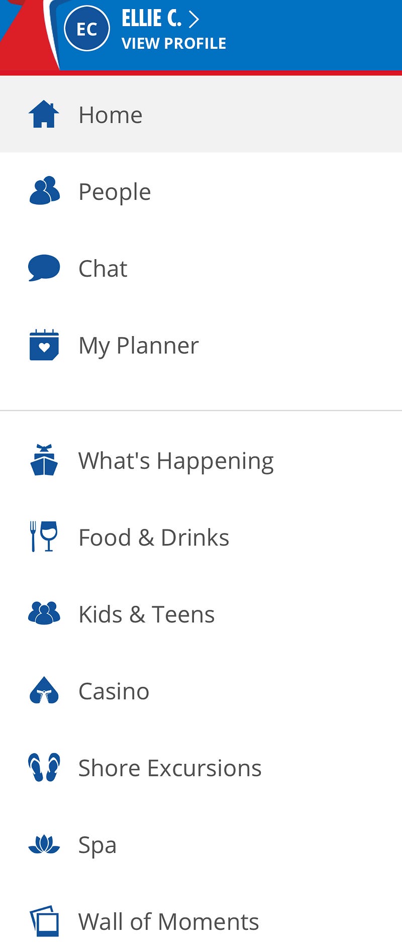 Carnival 有一個手機 App 叫 Carnival Hub,非常好用。只要連接上遊輪的免費 wifi (免費 wifi 只能拿來看 Carnival Hub,沒有辦法上其他網站),你就可以在 Food & Drinks 裡看到 main dining room 每天的早餐/晚餐菜單 & 其他餐廳的營業時間、What’s Happening 李可以看到每天的活動清單(喜歡的話可以存成書籤,跟你同房的人也會看到你標註了感興趣的活動),還可以在 Wall of Moments 裡上傳自己遊輪行程的照片與同船的人分享。
